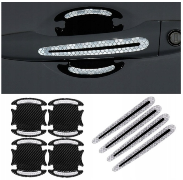Odolné a trvanlivé ochranné nálepky vyrobené technológiou 3D živice sú ideálnym riešením na ochranu výklenkov dverných kľučiek a dverí pred poškriabáním a nárazmi. Vďaka uhlíkovej štruktúre a reflexným prvkom nielen chránia lak, ale aj zvyšujú bezpečnosť vozidla po zotmeni.